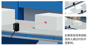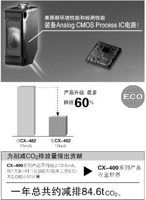 最多降低功耗60%,減輕環(huán)境負(fù)荷 CX-400系列裝備新開(kāi)發(fā)的定制IC電路,在提高環(huán)境適應(yīng)性、檢測(cè)性能和可靠性方面做了種種改進(jìn),產(chǎn) 品陣容共計(jì)140種。產(chǎn)品升級(jí),各機(jī)型平均降低功耗44%,最多者降耗達(dá)60%。為節(jié)能、減排CO2和保 護(hù)地球環(huán)境做出貢獻(xiàn)。 產(chǎn)品升級(jí),抗干擾性能更強(qiáng) 抗干擾性能強(qiáng)的CX-400型獲得進(jìn)一步增強(qiáng)。裝備耐變頻器電路,能使峰值波長(zhǎng)進(jìn)行最佳偏移,使產(chǎn)品的耐變頻器光波或高壓變頻調(diào)速電機(jī)的高頻干擾等性能進(jìn)一步增強(qiáng)。 嚴(yán)酷環(huán)境能仍能發(fā)揮穩(wěn)定的檢測(cè)性能 根據(jù)機(jī)種采用的材質(zhì)的不容、采用抗油、冷卻液能力強(qiáng)的亞克力和抗酒精強(qiáng)的PC。 更有抗噪音、干涉、寒冷的產(chǎn)品。皆為CX-400系列的特點(diǎn)。 抗油?冷卻液能力強(qiáng)的[CX-41□/42□/49□] 透過(guò)型、回歸反射型(CX-48□除外)、擴(kuò)散反射型的透鏡材質(zhì)采用抗冷卻液能力強(qiáng)的丙烯。即使安裝在油霧飛散的金屬加工機(jī)械的周邊,亦可放心使用。并具有達(dá)IP67(IEC)的保護(hù)構(gòu)造。 不易受酒精腐蝕[CX-44□/48□] 前罩、顯示罩均采用了不易受酒精腐蝕的聚碳酸酯材質(zhì)。設(shè)置在噴灑酒精洗劑的食品加工設(shè)備周圍時(shí),也可放心使用。并具有達(dá)IP67(IEC)的保護(hù)構(gòu)造。 注意:CX-48□附帶反光鏡請(qǐng)勿沾到清洗液。 重視環(huán)保 ■徹底消除浪費(fèi),大幅減輕環(huán)境負(fù)荷 CX-400系列不僅備有3種長(zhǎng)度的電纜可選,還簡(jiǎn)化包裝,從而減少了廢棄物。而且采用聚乙烯包裝袋,不會(huì)產(chǎn)生有害氣體。 自動(dòng)防干擾功能 采用防干擾設(shè)計(jì),最多可緊貼安裝2臺(tái)傳感器。 耐環(huán)境、IP67設(shè)計(jì)結(jié)構(gòu) 保護(hù)構(gòu)造IP67,有水和灰塵的現(xiàn)場(chǎng),可正常使用。 注意:在檢測(cè)過(guò)程中有水、可檢測(cè)到水。 抗干擾 利用防干擾功能最多可緊貼安裝2臺(tái)傳感器。 適應(yīng)嚴(yán)寒地帶的能力也很強(qiáng) 即使是在-25℃的嚴(yán)寒地帶,亦可發(fā)揮出穩(wěn)定的性能。 節(jié)省施工 備有M8連接器型和M12中繼連接器型。有助于減少安裝、維護(hù)工時(shí)。此外,電纜型的電纜長(zhǎng)度備有0.5m、2m和5m型。不會(huì)出現(xiàn)多余的廢棄物。 返回頁(yè)首 透過(guò)型[CX-414□]的特點(diǎn) 保護(hù)構(gòu)造IP67 繼承CX-400系列的保護(hù)等級(jí) 實(shí)用2m檢測(cè)距離 防干擾性能強(qiáng)化 相鄰兩臺(tái)傳感器防干涉距離為80mm (檢測(cè)距離在550mm處) BGS功能的完美應(yīng)用[CX-445、CX-446] ■異色工件通過(guò)時(shí) 可以幾乎等同的距離檢測(cè)黑色和白色工件。即便在異色工件流通的生產(chǎn)線上進(jìn)行換產(chǎn)時(shí),也無(wú)需調(diào)節(jié)器調(diào)節(jié)。 ■無(wú)背景時(shí) 工件與背景物體分離時(shí)。 線性光點(diǎn)設(shè)計(jì)[CX-46□] 5mm×30mm線性光點(diǎn)設(shè)計(jì),穩(wěn)定檢測(cè)有鏤空或凹凸表面的產(chǎn)品。 安裝簡(jiǎn)單 無(wú)需靈敏度調(diào)節(jié),即可使用;兩孔設(shè)計(jì),節(jié)省安裝工時(shí)。 穩(wěn)定檢測(cè) 特殊光學(xué)透鏡設(shè)計(jì),受工件顏色影響較小;即便在異色工件流通的產(chǎn)線上也可穩(wěn)定檢測(cè)。 紅外光束之強(qiáng)光束[CX-412/413] 實(shí)現(xiàn)檢測(cè)距離為15m的長(zhǎng)距離檢測(cè)。強(qiáng)勁的穿透力,亦可用于包裝物內(nèi)部的檢測(cè)等。 耐塵、耐臟[CX-412/413] 采用紅外光束作為光源。與紅色光束型產(chǎn)品相比,更加耐塵、耐臟。 帶偏極濾光器回歸反射型[CX-491] 內(nèi)置偏極濾光器,就連鏡面體亦可穩(wěn)定檢測(cè)。 綽綽有余的檢測(cè)距離5m[CX-493] 使用便于對(duì)準(zhǔn)光軸的紅色光束型產(chǎn)品,可進(jìn)行長(zhǎng)度為5m的長(zhǎng)距離檢測(cè)。亦可滿足橫向?qū)挾容^寬的自動(dòng)卷簾門的需求。 透明物體檢測(cè)專用型問(wèn)世[CX-48□] 采用獨(dú)特的光學(xué)系統(tǒng)和專門檢測(cè)透明物體的電路。與以往產(chǎn)品相比,可穩(wěn)定地檢測(cè)更薄的透明物體。 采用高亮度光點(diǎn)光,便于對(duì)準(zhǔn)光軸[CX-423] 采用可視性良好的高亮度紅色LED光點(diǎn)光,使得檢測(cè)位置一目了然。此外,當(dāng)設(shè)定距離為100mm時(shí)可采用約φ2mm的超小光點(diǎn);當(dāng)設(shè)定距離為200mm時(shí)可采用約φ5mm的小光點(diǎn)。還能檢測(cè)細(xì)小的工件。 減少光點(diǎn)調(diào)節(jié)器的調(diào)節(jié)工時(shí)[CX-42□] 根據(jù)檢測(cè)距離的不同,備有豐富齊全的品種。因此,可很方便地對(duì)光點(diǎn)進(jìn)行最佳調(diào)整。 返回頁(yè)首 以2%以下的應(yīng)差可檢測(cè)小到0.4mm的高低差[CX-441/443] 相對(duì)于原有型號(hào),先進(jìn)的光學(xué)系統(tǒng)將檢測(cè)性能提高約2.5倍。即便是小到0.4mm的高低差亦可準(zhǔn)確地檢測(cè)出。 可根據(jù)用途進(jìn)行選擇的2種光點(diǎn)直徑[CX-441/443] 在檢測(cè)距離為50mm的傳感器產(chǎn)品中備有最適用于檢測(cè)細(xì)小工件的小光點(diǎn)(約φ2mm型)以及亦可適用于孔較多或容易顫振的工件的大光點(diǎn)(約φ6.5mm型)。 